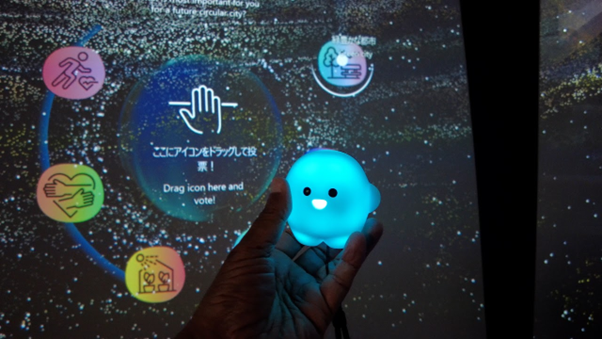 館内のタッチポイントに<サーキュラー>をタッチすると、ブルブルと震えたのちに、解説をしてくれます。かわいいおしゃべりで展示を解説してくれるだけではなく、他の<サーキュラー>と接触させると色が変わり歌いだしたり、返却時に滑り台へ戻すと「ワー」と言いながら転がっていくといった遊び心が、来場者の心を掴みました。