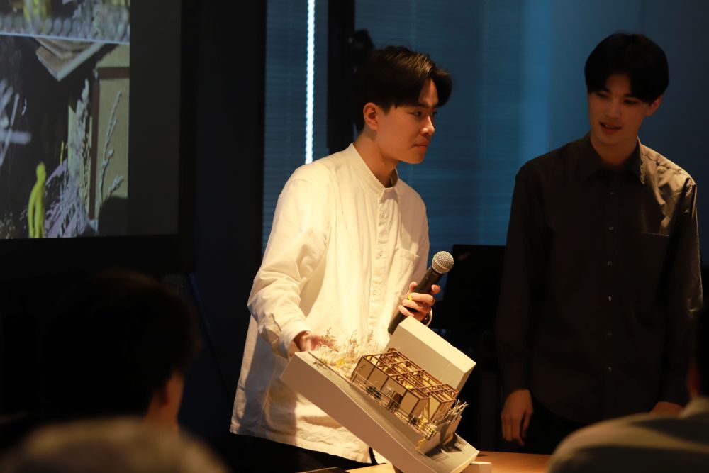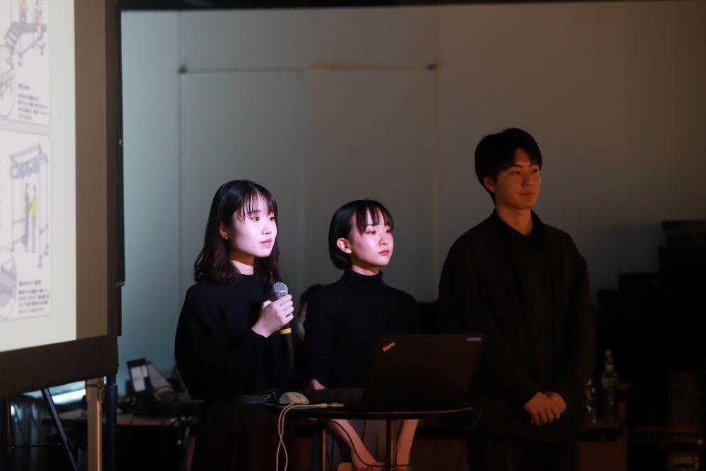 今年度の頂点に輝いたのは、柴﨑さん・佐伯さんによる「夢想列車」。審査員特別賞とのW受賞という快挙を成し遂げました。最終プレゼンでひときわ印象的だったのは、佐伯さんの電車愛。資料には、列車本数の少ない単線駅と、通過・すれ違い・追い越し列車のある駅、それぞれのケースを踏まえた運行パターンが描かれており、さらに日時別の具体的なダイヤまで細かく作り込まれていました。また、電車の天井が開閉可能かどうか、面積と客単価の比率はどう考えるかといった質問にも即座に回答し、審査員席からは思わず笑いがこぼれる場面も。