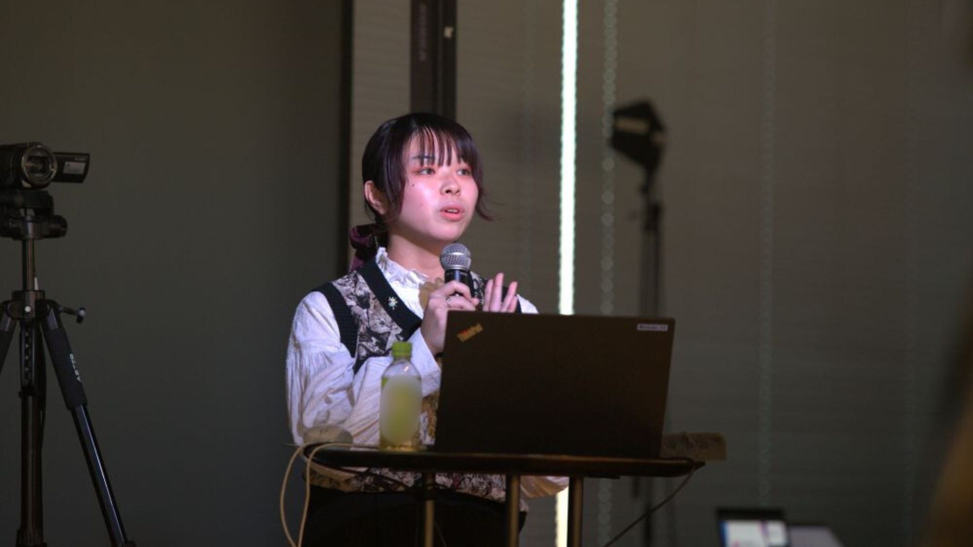 「提出直前にインフルエンザにかかって必死で絵を描き上げました(笑)。何より楽しかったのは、二次審査と最終審査で、空間づくりのプロの方々からフィードバックをいただけたことです。「テーマ性を持たせた編集をするなど、選書の切り口があるとさらに面白い」「本に触れてない人から、大の本好きまでターゲットごとに仕掛けの違いがあるといいかも」など、自分では考えていなかったご意見をいただき、新しい視点を持つきっかけになりました。最終案はひとりではなく、みなさんと作り上げたものだと感じています」 。素敵なコメントに会場も深く聞き入っていました。