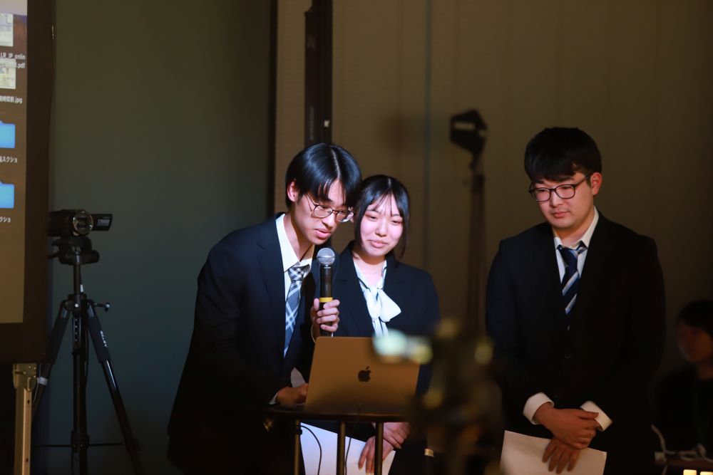 毎年恒例ではありますが、本日壇上に呼ばれた3組の受賞者のみなさまは、ご自身がどの賞を受賞しているのか、本番の発表まで知らされていません。今年の最終3組はいずれも学生。まさに誰がどの賞を受賞してもおかしくない緊張感の中、まず発表されたのは学生賞。遠藤さん、越後さん、大澤さんによる「アスレクック」が選ばれました。3人が作品を仕上げたのは、主に夏休みの期間。オンラインホワイトボード「Miro」を使い、時には5時間ぶっ続けでWeb会議をしながら、「ああでもない、こうでもない」と議論を重ねたといいます。「作業は3人で分担しました。最初に絵を描く人、それに色を塗る人、フィニッシュする人という感じで。細かいところにこだわり始めたら終わりが見えなかったのですが、それも含めてとても楽しい経験でした。いただいた賞金で3Dプリンターを買いたいと思います!ありがとうございました!」。