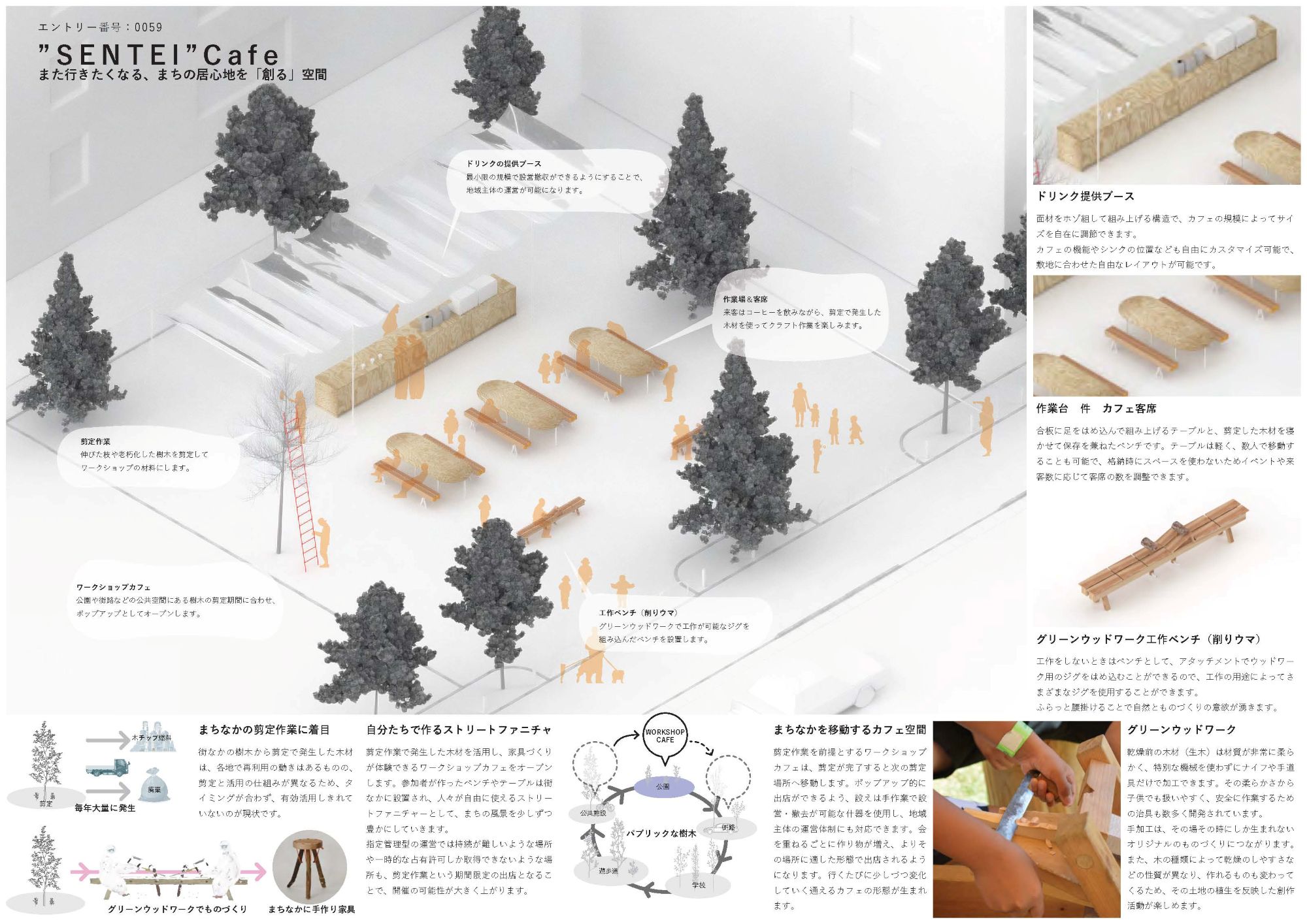 街なかの樹木を剪定した際に出る木材は、十分に活用されていない現状。その課題に着目した中馬さんが提案するのが、「剪定木」をテーマにしたワークショップカフェです。 参加者はコーヒーを片手に、剪定で発生した木材を使ってクラフト作業を楽しみます。みんなで作ったベンチやテーブルは街なかに設置され、誰でも自由に使えるストリートファニチャーに生まれ変わります。