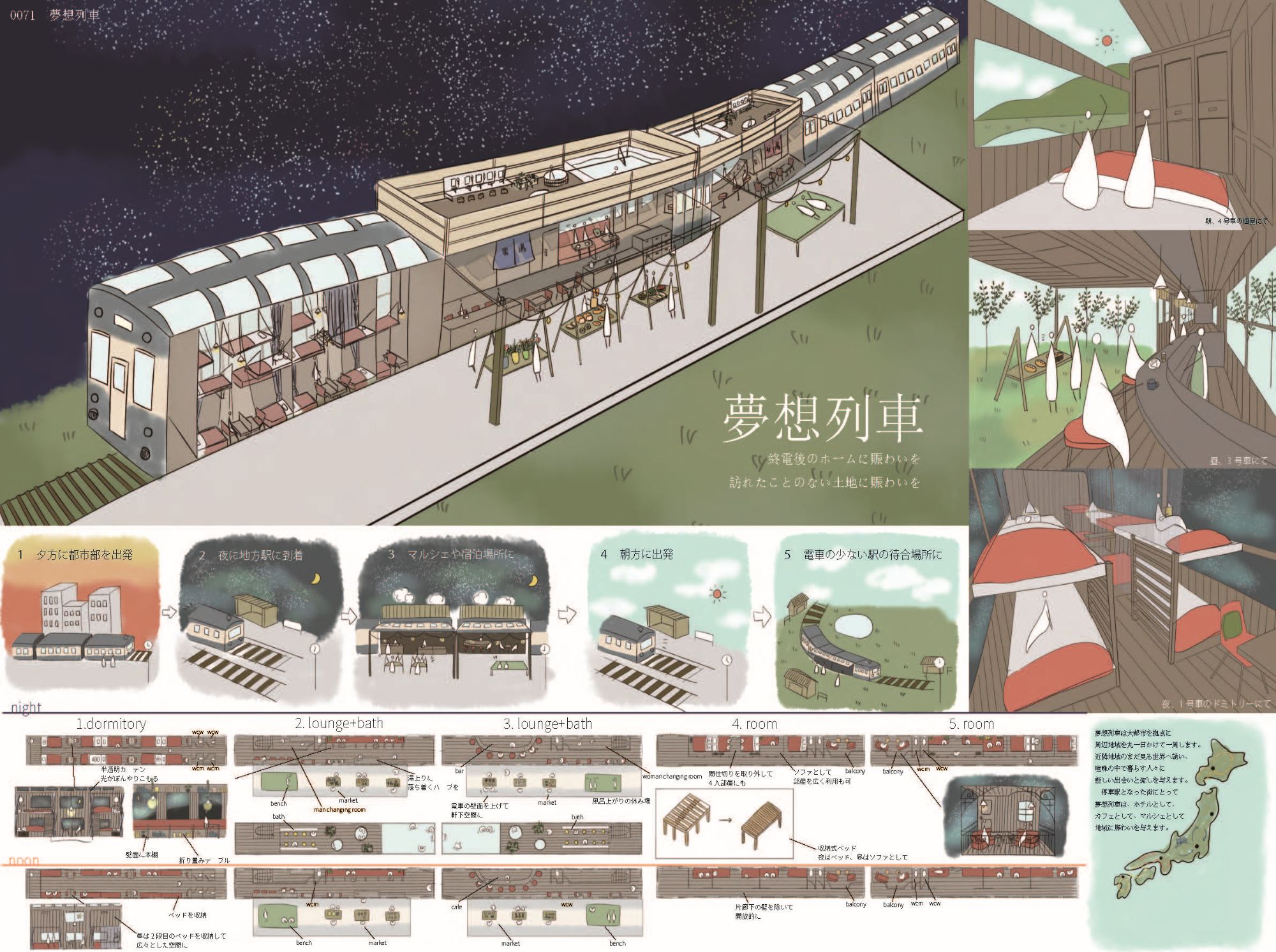 翌朝列車が走り出し、昼間に到着するのは、駅待合室がないような地方の駅。そこで長時間停車することで、カフェのように立ち寄れる列車空間が生まれ、また違った地域との交流が広がります。 これはモビリティなのか、はたまた空間なのか?どちらにせよ、1泊24,000円を想定した夢想列車は、思わず定期的に乗りたくなる、そして「また行きたくなる!」。