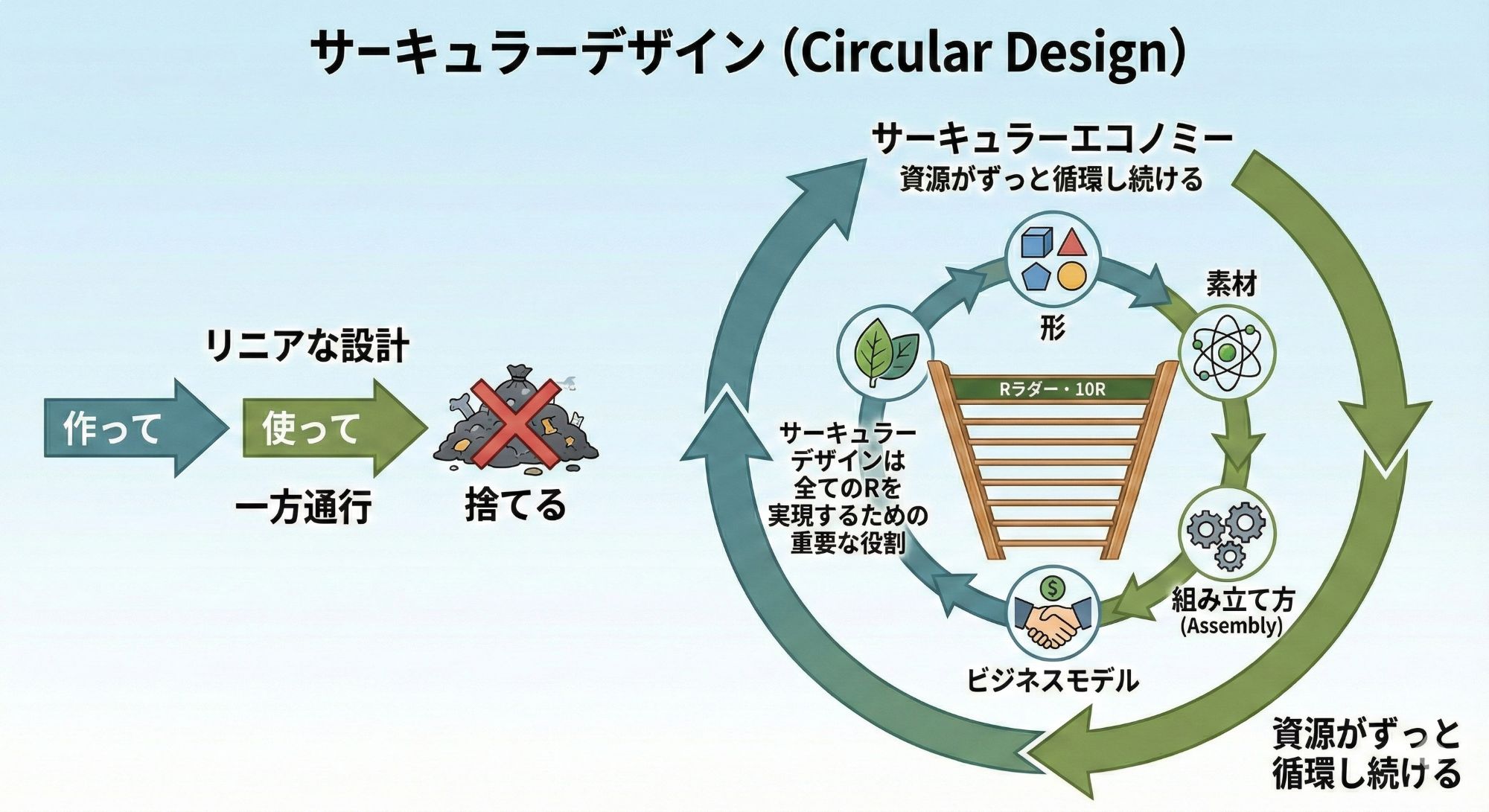廃棄物が出ないように、最初から製品や仕組みを設計することです。「作って、使って、捨てる」一方通行(リニア)な設計ではなく、「資源がずっと循環し続ける」サーキュラーエコノミーを前提に、形、素材、組み立て方、そしてビジネスモデルまでを含めてデザインする手法を指します。Rラダー・10Rとの関係性において、サーキュラーデザインは全てのRを実現するための重要な役割を持っています。