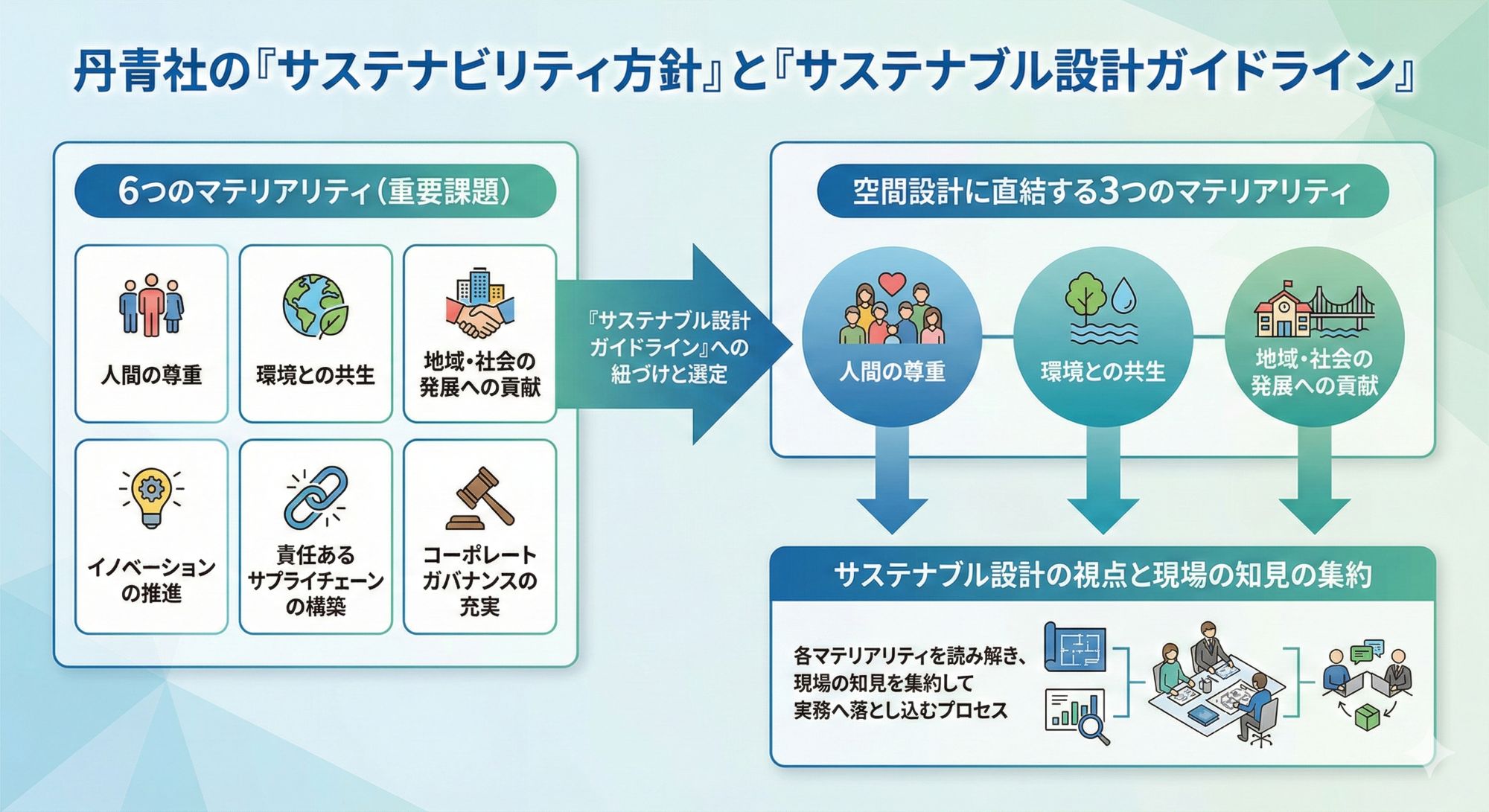 「丹青社の『サステナビリティ方針』では6つのマテリアリティ(重要課題)を定めています。人間の尊重、環境との共生、地域・社会の発展への貢献、イノベーションの推進、責任あるサプライチェーンの構築、コーポレートガバナンスの充実です。『サステナブル設計ガイドライン』もそれに紐づけたものとして考えました。マテリアリティから、空間設計に直結する『人間の尊重』『環境との共生』『地域・社会の発展への貢献』の3つを選定しました。それぞれについてサステナブル設計の視点で読み解き、現場の知見を集約していったのです」