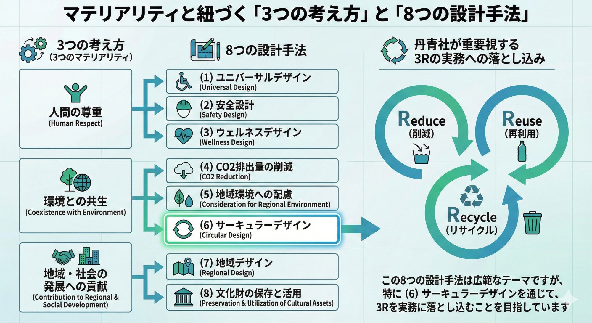 「この8つの設計手法は、『人間の尊重』から『地域・社会の発展への貢献』までを網羅する広範なテーマですが、特に『環境との共生』に属する(6)サーキュラーデザインを通じて、丹青社が重要視するReduce(削減)、Reuse(再利用)、Recycle(リサイクル)という3Rを実務に落とし込むことを目指しています」
