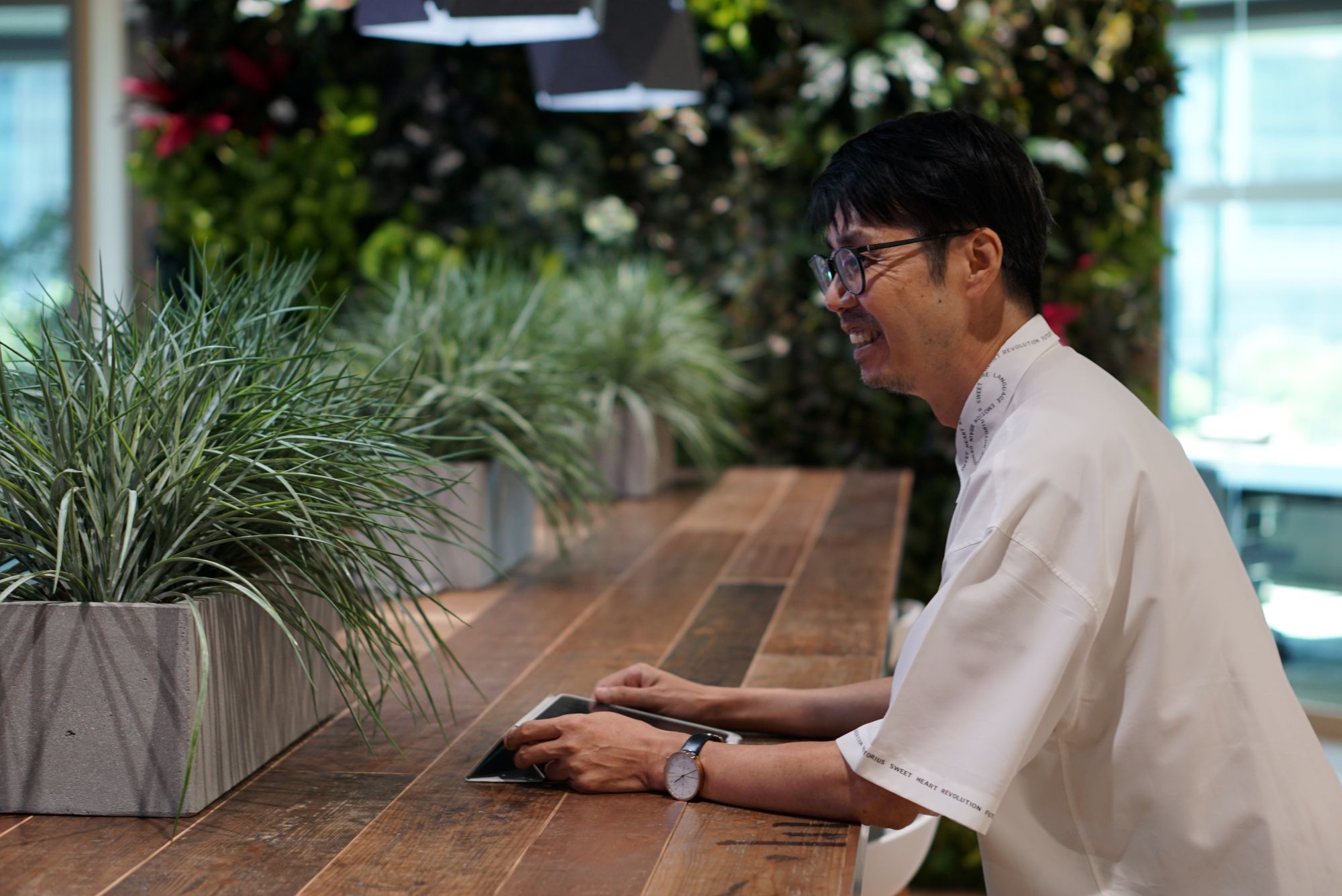 「名古屋では廃棄衣料をアップサイクルした『PANECOⓇ(パネコ)』を導入しました。関西では、さらに古材を使うことに取り組みました。被災された能登の古材で大きなテーブルを作ったのですが、材自体の選定のためにデザイナーに現地まで行ってもらいました。単なる移転や増床ではニュースになりませんが、こうした取り組みがあると空間づくりの会社としてアピールもでき、苦労はありましたが良かったと思います」