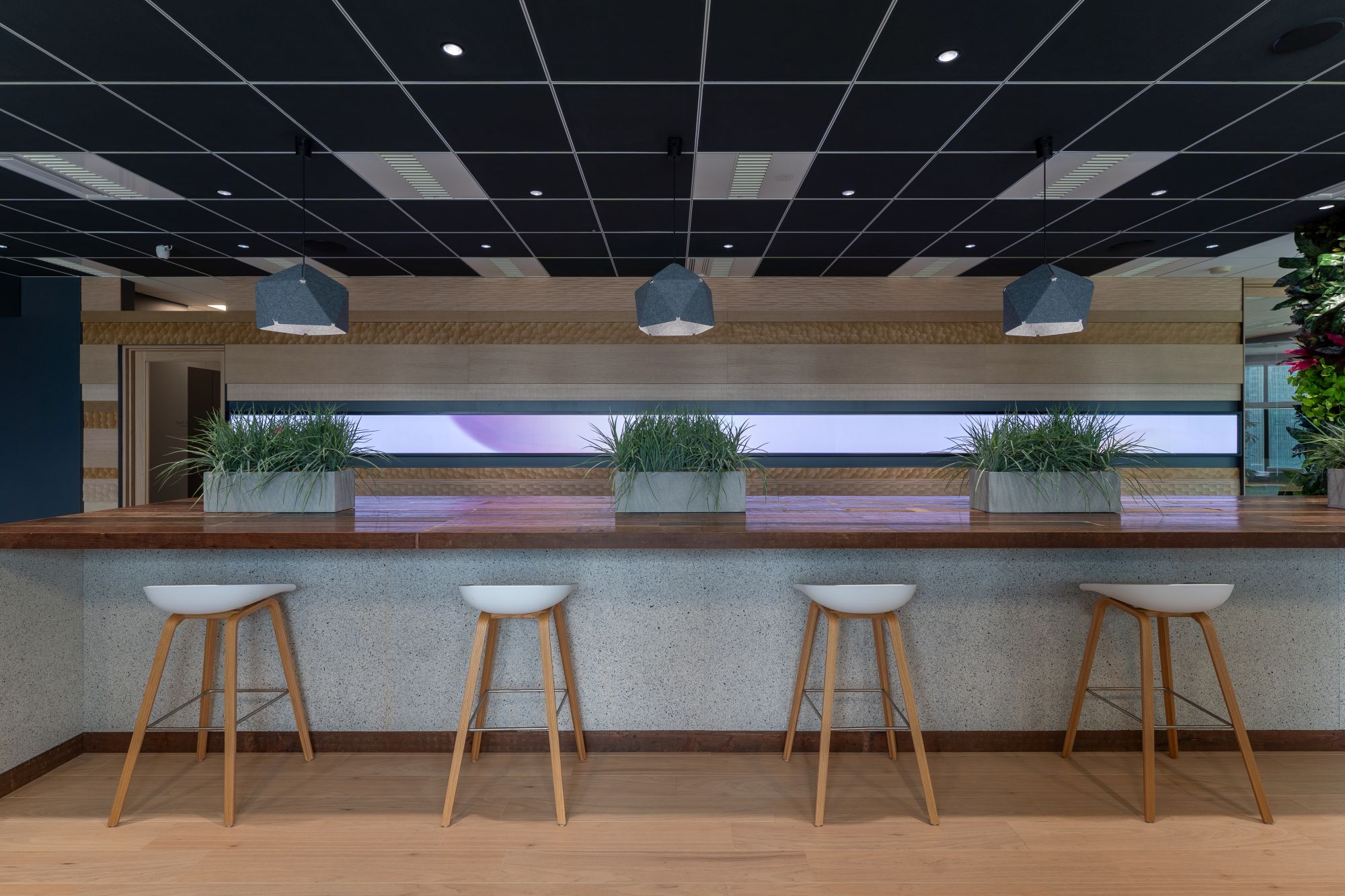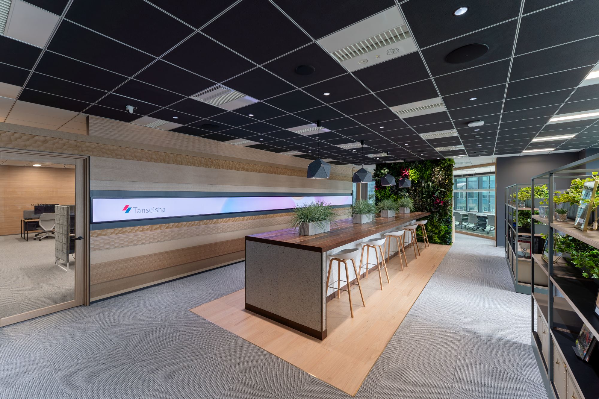 那須野さん「本来ならば、サステナブル素材だけで全て仕上げてもここまで魅力的に作れました、ということがやりたいです。まだまだ不燃認定素材は少ないですし、オフィスの家具も中古の手配は可能ですが、保証や在庫の問題などがあります。10年後、新品の材料を使うことが非常識になる時代が来るかもしれない。そんな時代を意識した先陣を切って行けたらと思います」
