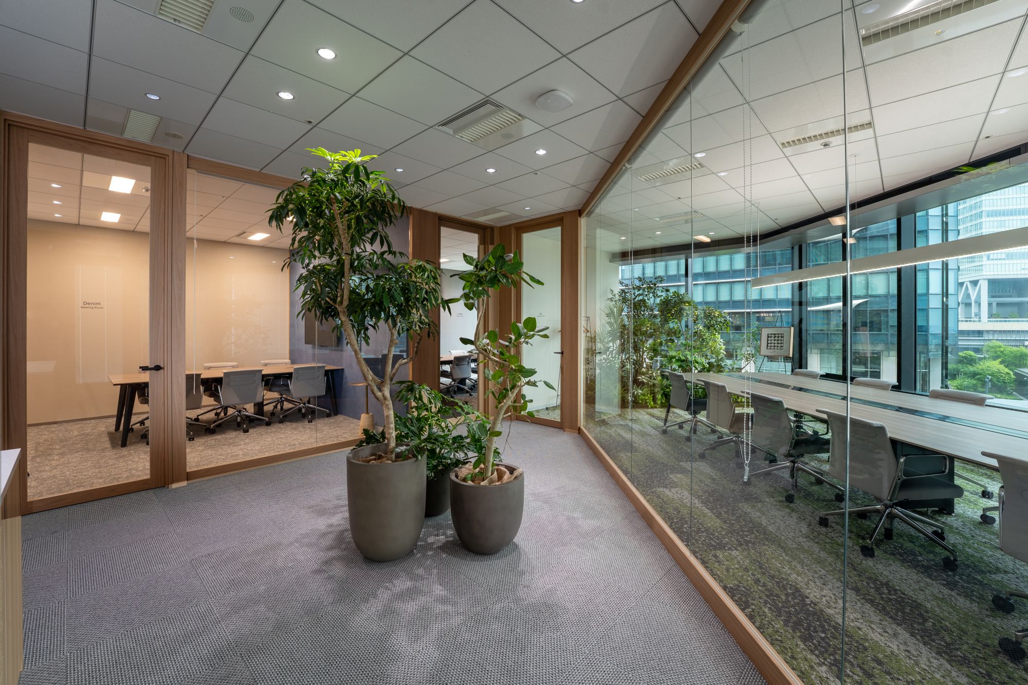「聞かれてもいないのに『この素材はサステナブルで…』と説明するのではなく、自然に話題となるように工夫したい。そこで、会議室の名前を『EGG』『DENIM』『COFFEE』としました。それぞれ卵・デニム・コーヒーの廃材や端材を利用した塗料やパネルを使っています。『変な名前だね』と話題になれば、それが糸口になります」