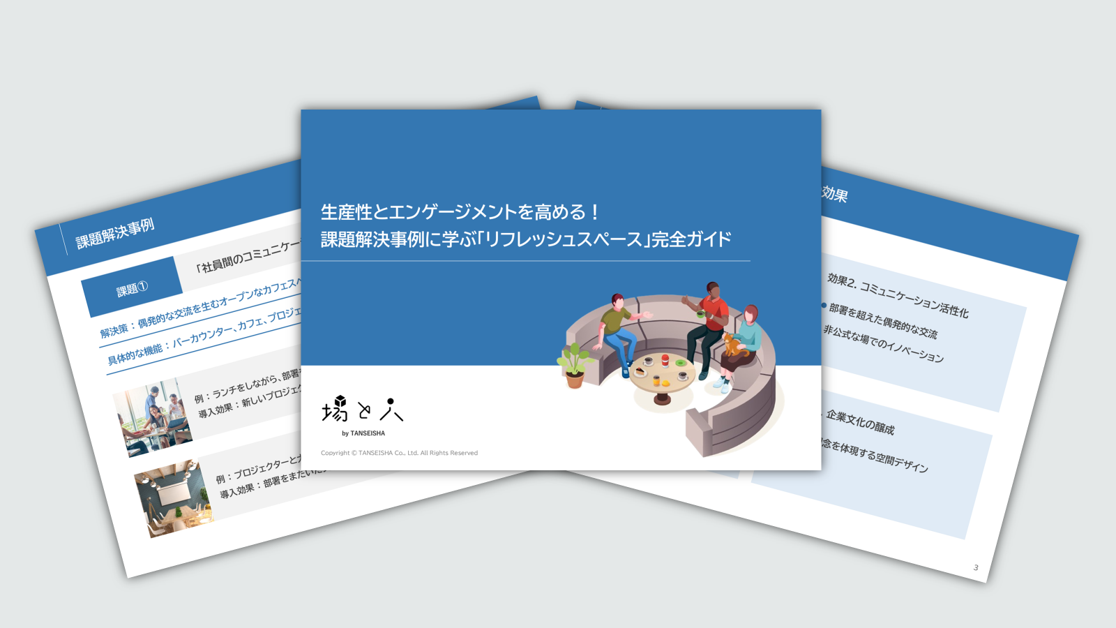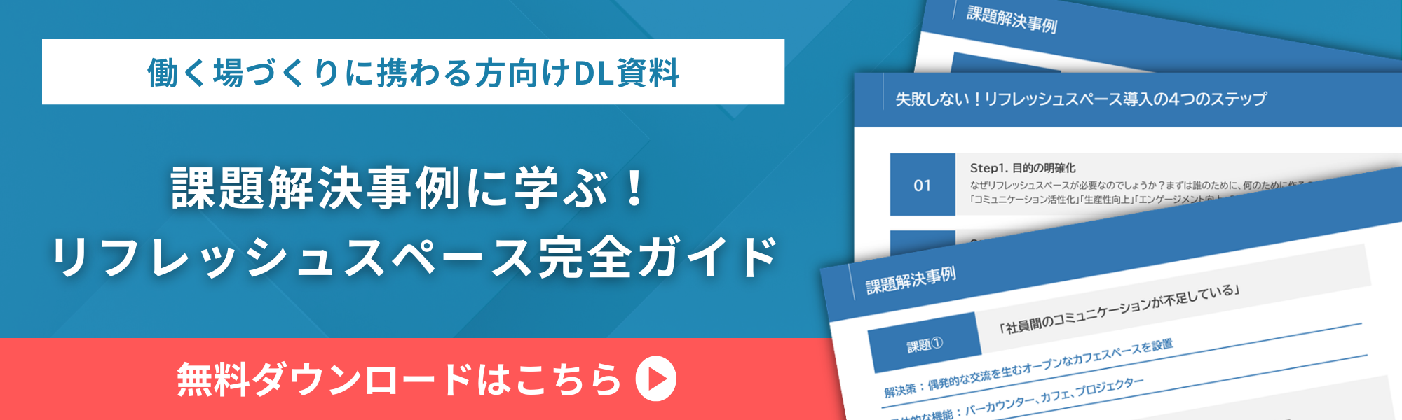 事例に学ぶ「リフレッシュスペース」完全ガイド![]() | ▼この資料でわかること ・リフレッシュスペースがもたらす4つの効果 ・課題解決事例 ―社員間のコミュニケーションが不足している ―集中力が続かない、生産性が上がらない ―社員のエンゲージメント・満足度を高めたい ・リフレッシュスペース導入の4つのステップ >無料でダウンロードする |